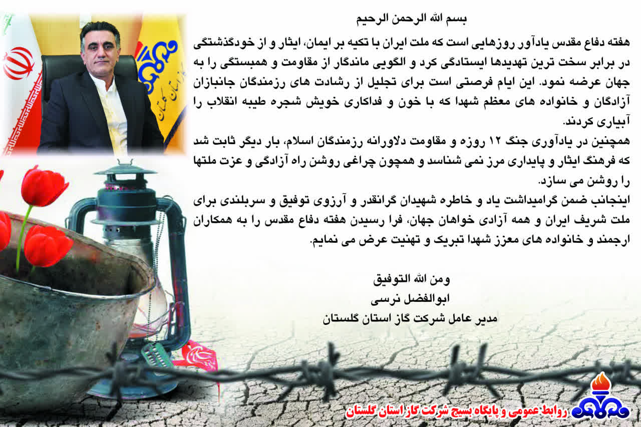 بیانیه مدیرعامل گاز گلستان به میمنت فرارسیدن هفته دفاع مقدس